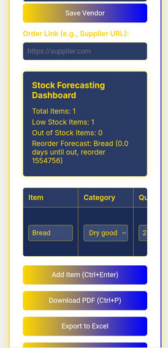 Streamline inventory for your business, kitchen, or club. Gaztech lets you efficiently track, forecast, and manage stock and vendors entirely from your browser—no installation or login required! Includes built-in PDF/Excel reports, restock alerts, custom categories, QR-coded order links, and secure archiving—all wrapped in a slick, mobile-friendly interface. Perfect for owners who want powerful features without IT hassle. Data is safely stored in your browser and can be easily exported for backup.
